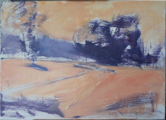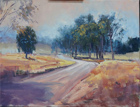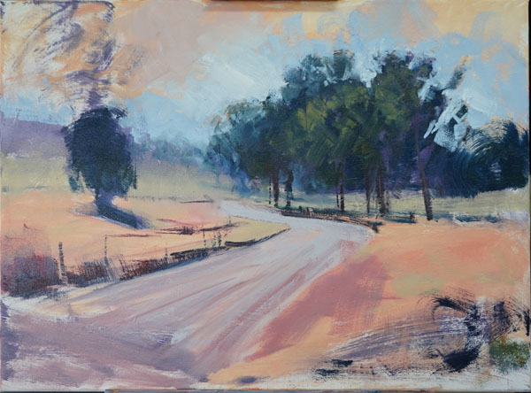 The distant grass and road colours were laid in as well as the dark gravel beside the road in the foreground. Red-violet is used to tame down the green. Make sure the brush strokes don't go all the same way.